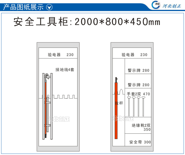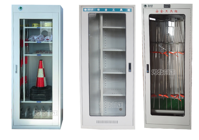 1、柜体是冷轧钢板卷压成型,厚度有1.0mm,1.2mm,1.5mm供选择。柜体表面采用静电防腐喷塑工艺,颜色为驼灰色,柜门装有通体透明钢化玻璃,透过玻璃可以看到分类有序的工器具。