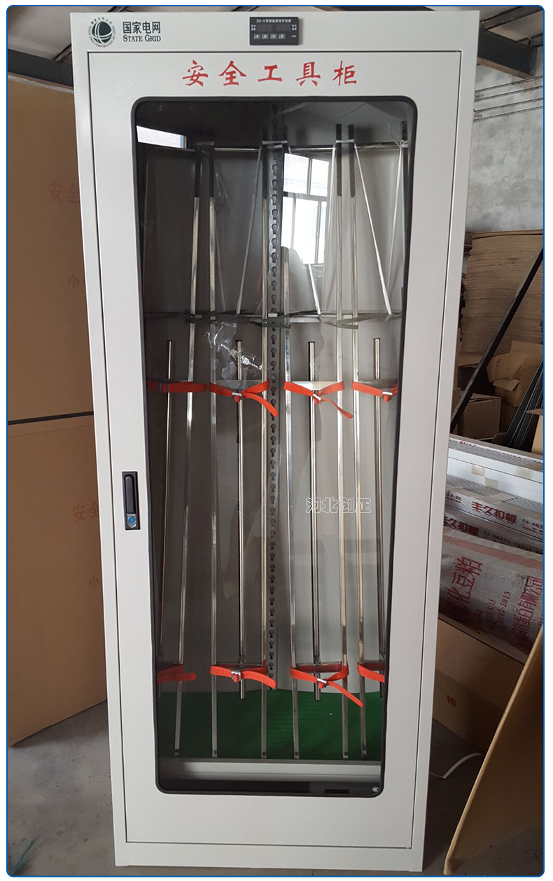 2、智能型安全工具柜装有温湿度显示表和控制操作面板,显示温湿度和设备运行状态。柜底可选择安装万向轮和定位螺杆;柜顶可选择安装吊杯,方便运输。应用于不同温湿度地区的不同电压等级的变电站、集控站、线路工区以及电力公司等单位。